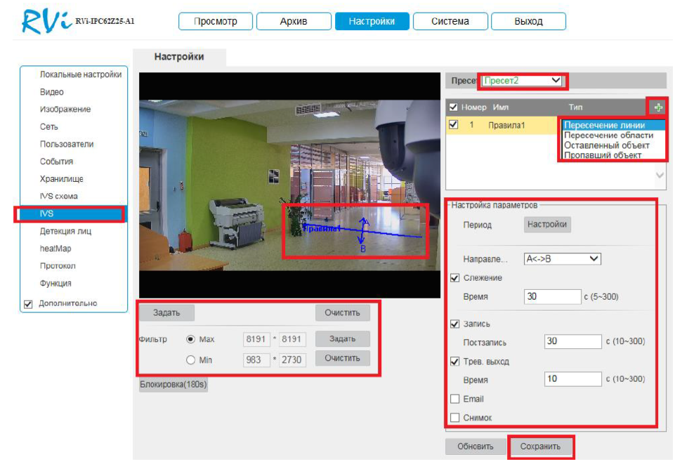 Пример настройки и использования IVS на камере RVi-IPC62Z25-A1