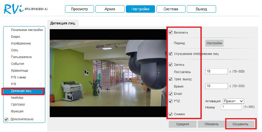 1.3 Переходим в пункт «Детекция лиц», отмечаем галку «Включить», настраиваем период, настраиваем необходимую реакцию на событие (Запись / PTZ / Тревожный выход / EMAIL / Cнимок) и нажимаем «Сохранить»